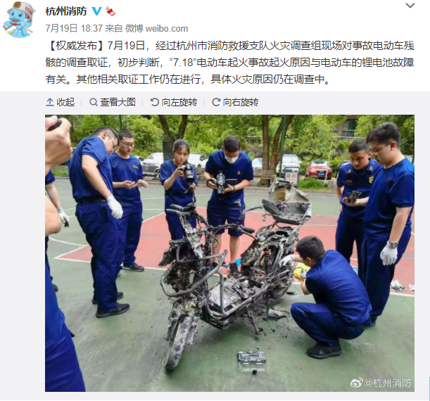 7月19日,经过杭州市消防救援支队火灾调查组现场对事故电动车残骸的调查取证,初步判断:“7.18”电动车起火事故起火原因与电动车的锂电池故障有关。其他相关取证工作仍在进行,具体火灾原因仍在调查中。