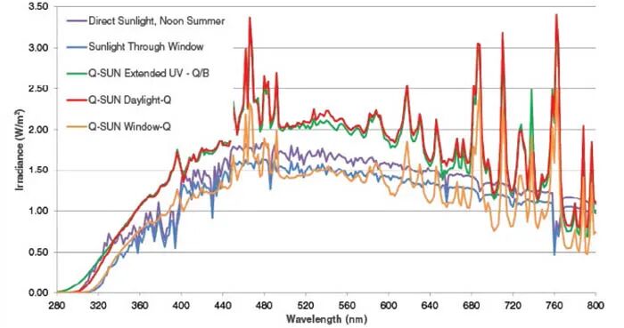 Q-SUN Xe-3-HSE氙灯耐气候箱的氙弧灯管最逼真地再现了全光谱太阳光,包括紫外线、可见光和红外线。对于许多材料来说,必须进行全光谱曝晒,以提供精确的模拟,尤其是做颜色变化和日晒色牢度测试时。