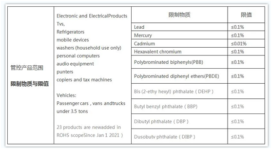 该标准的目的在于消除电子电器产品中的铅、汞、镉、六价铬、多溴联苯、多溴二苯醚以及四种邻苯共10项物质。